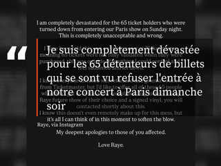 > TV > Infini People TV > Replay > Raye, «dévastée» pour ses fans qui se sont vu refuser l'entrée de son concert à Paris, leur fait un geste
