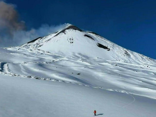 Un skieur dévale l'Etna en éruption. Le volcan sicilien recouvert d'un épais manteau de neige crache de la fumée suite à une nouvelle poussée d'activité.