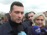 "Poussay, c'est le symbole de la France du travail", dit le président du Rassemblement National, Jordan Bardella, à côté de la présidente du groupe Rassemblement national à l'Assemblée nationale, Marine Le Pen, à leur arrivée à la foire de Poussay.