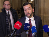 Laurent Wauquiez, patron des députés LR, se félicite devant la presse à l'Assemblée nationale de l'approbation par une large coalition de députés de son amendement rejetant le gel du barème de l'impôt sur le revenu.
