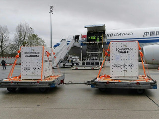 Les pandas Huan Huan et Yuan Zi, placés dans des caisses blanches, à l'aéroport de Roissy, sont transportés dans un avion pour un vol vers leur Chine natale, après avoir quitté le zoo de Beauval (Centre-Val de Loire). IMAGES