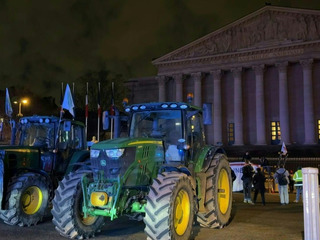 Environ 350 tracteurs entrent dans Paris et stationnent devant l'Assemblée nationale pour une nouvelle journée de mobilisation agricole, cette fois-ci aux couleurs de la FNSEA et des Jeunes Agriculteurs.