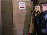 La cheffe des députés Rassemblement national, Marine Le Pen, arrive à l'audience du procès en appel des assistants parlementaires du Front national, ainsi que Patrick Maisonneuve, avocat du Parlement européen, Louis Aliot vice-président du RN et Wallerand de Saint-Just, ancien trésorier du FN. IMAGE...
