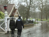 Deux policiers marchent près de l'entrée du Royal Lodge, l'ancienne résidence de l'ex-prince Andrew, où les perquisitions se poursuivent pour la deuxième journée consécutive après son arrestation. Le membre déchu de la famille royale, désormais connu sous le nom d'Andrew Mountbatten-Windsor, a été "...