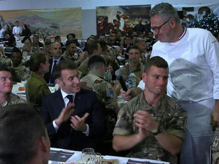 Emmanuel Macron s'attable avec des militaires français déployés aux Emirats arabes unis, pour un repas de fête préparé par les cuisiniers de l'Élysée à l’occasion du traditionnel déplacement de Noël auprès des troupes.