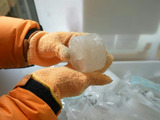Dans une chambre froide de l'université d'Hokkaido, un morceau de glace prélevé au Tadjikistan. L'échantillon pourrait aider à comprendre pourquoi les glaciers de ce pays résistent à la fonte rapide observée ailleurs.