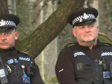 Deux policiers marchent près de l'entrée du Royal Lodge, l'ancienne résidence de l'ex-prince Andrew, où les perquisitions se poursuivent pour la deuxième journée consécutive après son arrestation. Le membre déchu de la famille royale, désormais connu sous le nom d'Andrew Mountbatten-Windsor, a été "...