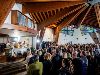 Dans le froid ensoleillé de Crans-Montana dimanche, des centaines de personnes ont assisté à une messe à l'extérieur de la chapelle Saint-Christophe de Crans bondée.