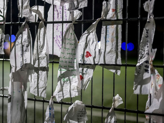 Devant le bar Le Constellation, ravagé par les flammes, un autel orné de fleurs, de bougies, de peluches et de photos des victimes était recouvert d'une toile blanche pour le protéger des flocons.