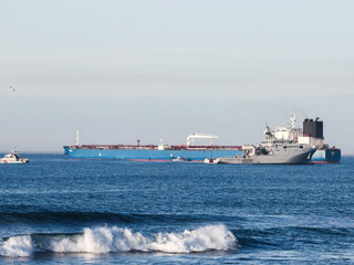 Le pétrolier est au mouillage dans le golfe de Fos, à quelque 500 m du rivage de la ville de Martigues, entouré d'un navire de la Marine nationale ainsi que de deux vedettes de la gendarmerie.
